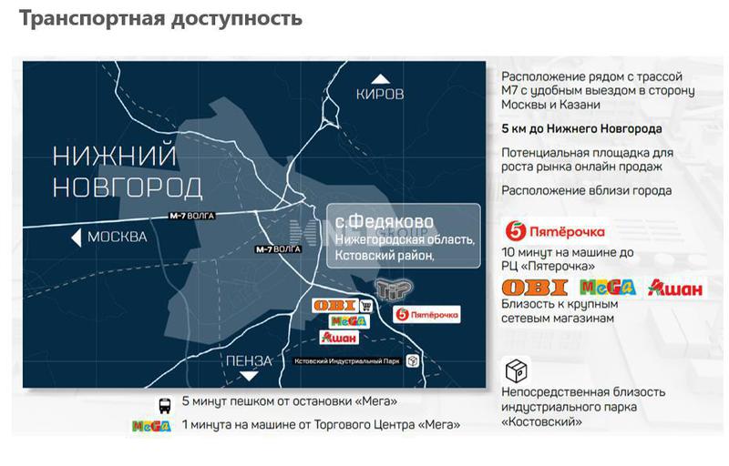 На юго-востоке Московской области расположены крупные города с населением в несколько сотен тысяч человек: Жуковский, Раменское, Островцы. Развита дорожная сеть, в том числе близость к трассе Рязанское шоссе, что обеспечит комфортные условия для логистики.